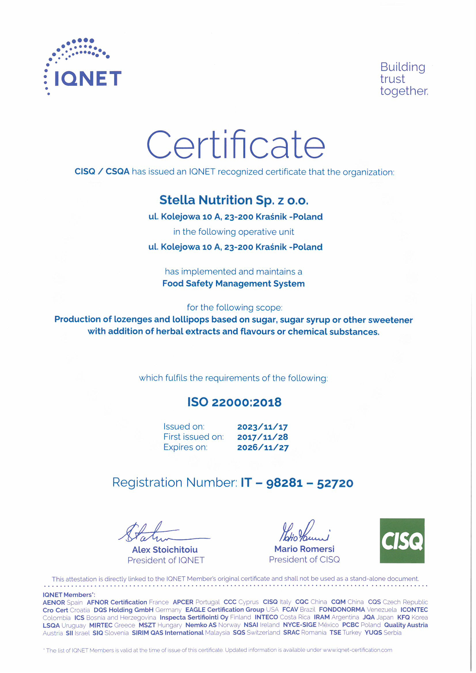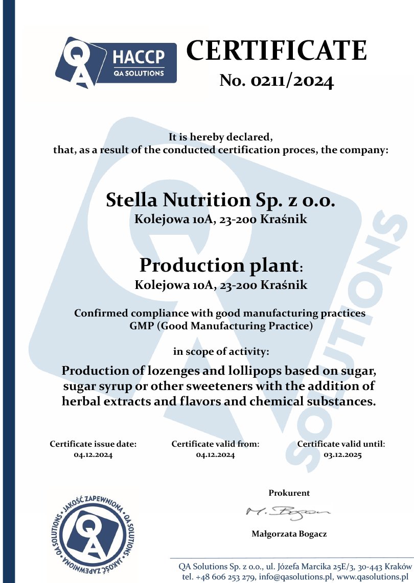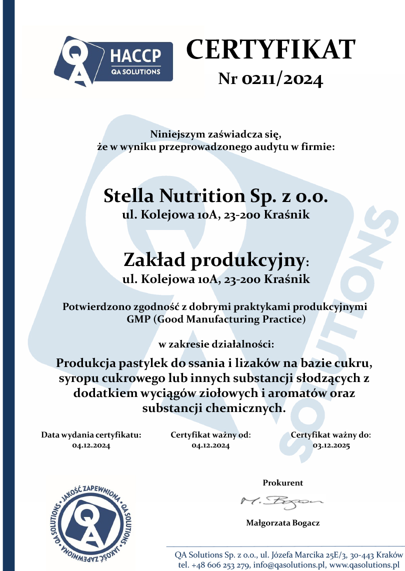 Stosujemy rygorystyczne systemy zapewnienia jakości, potwierdzone certyfikatami ISO 22000 oraz GMP.